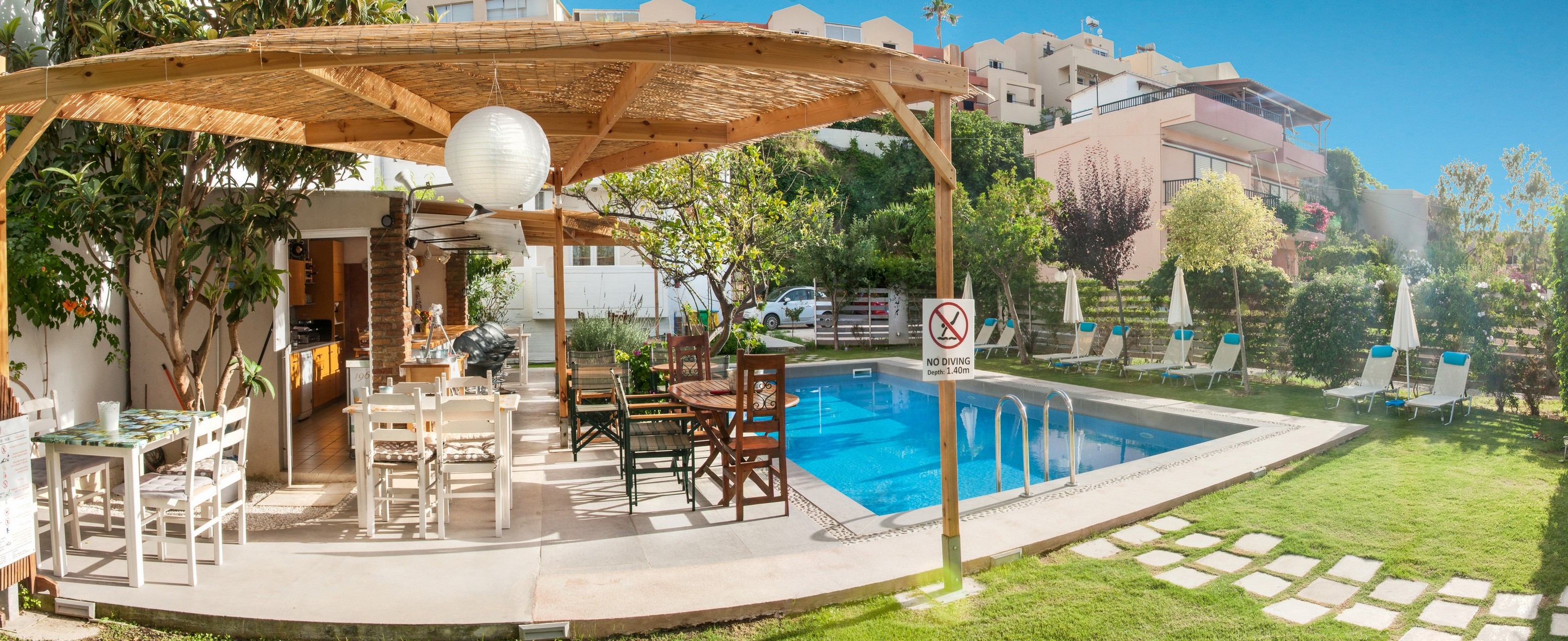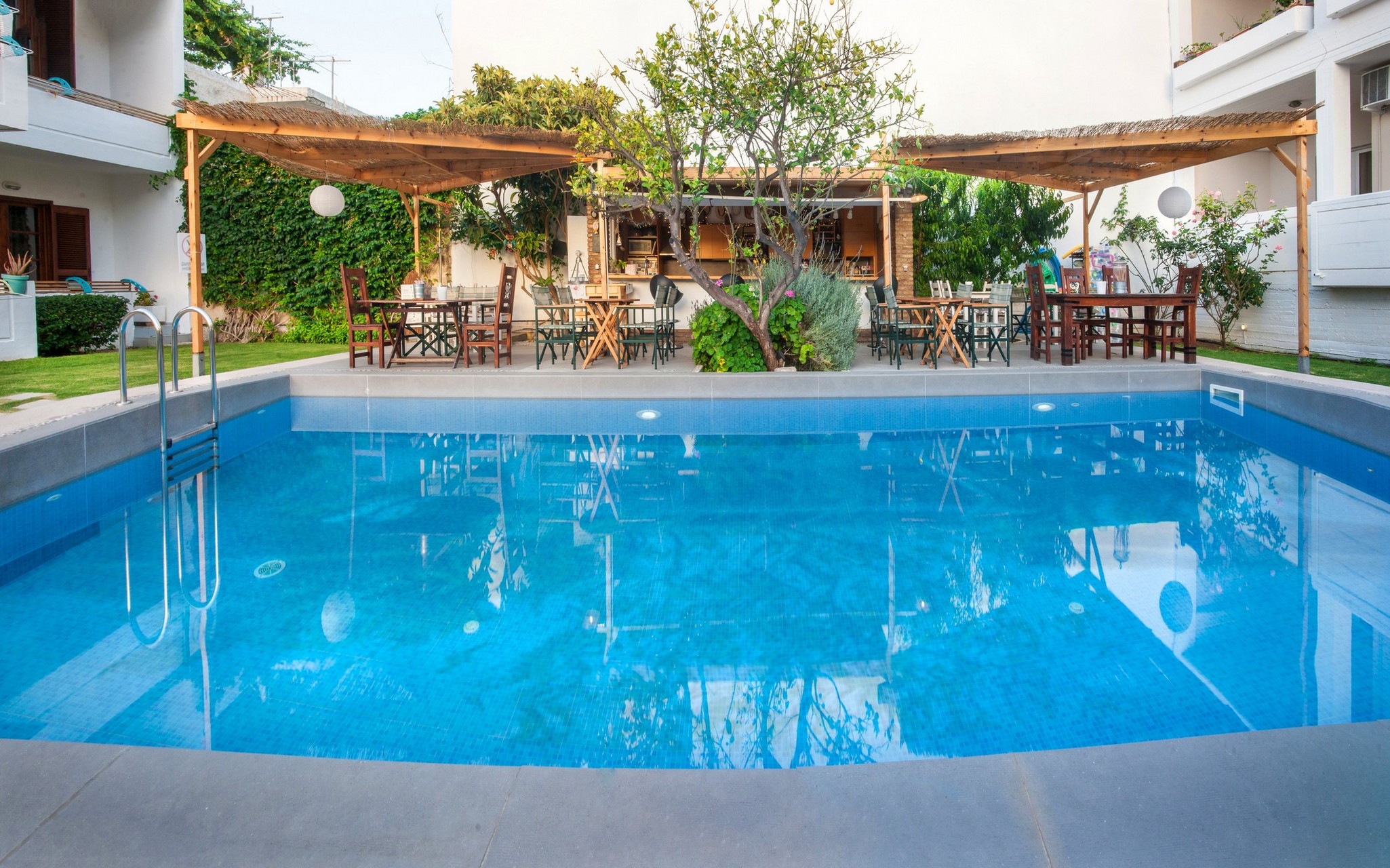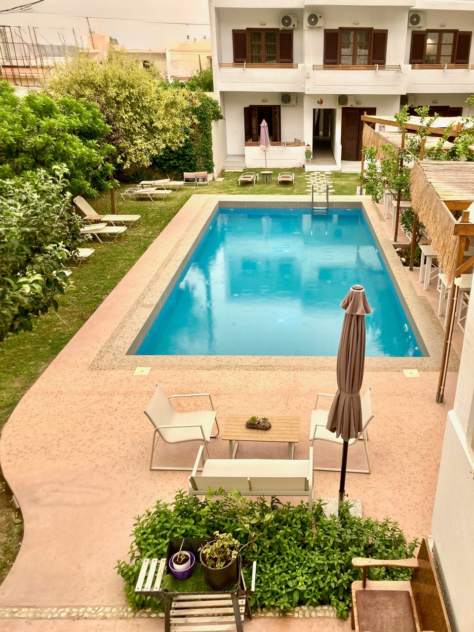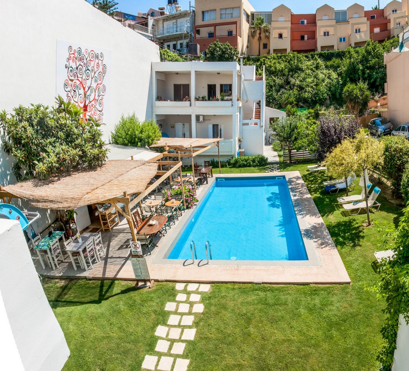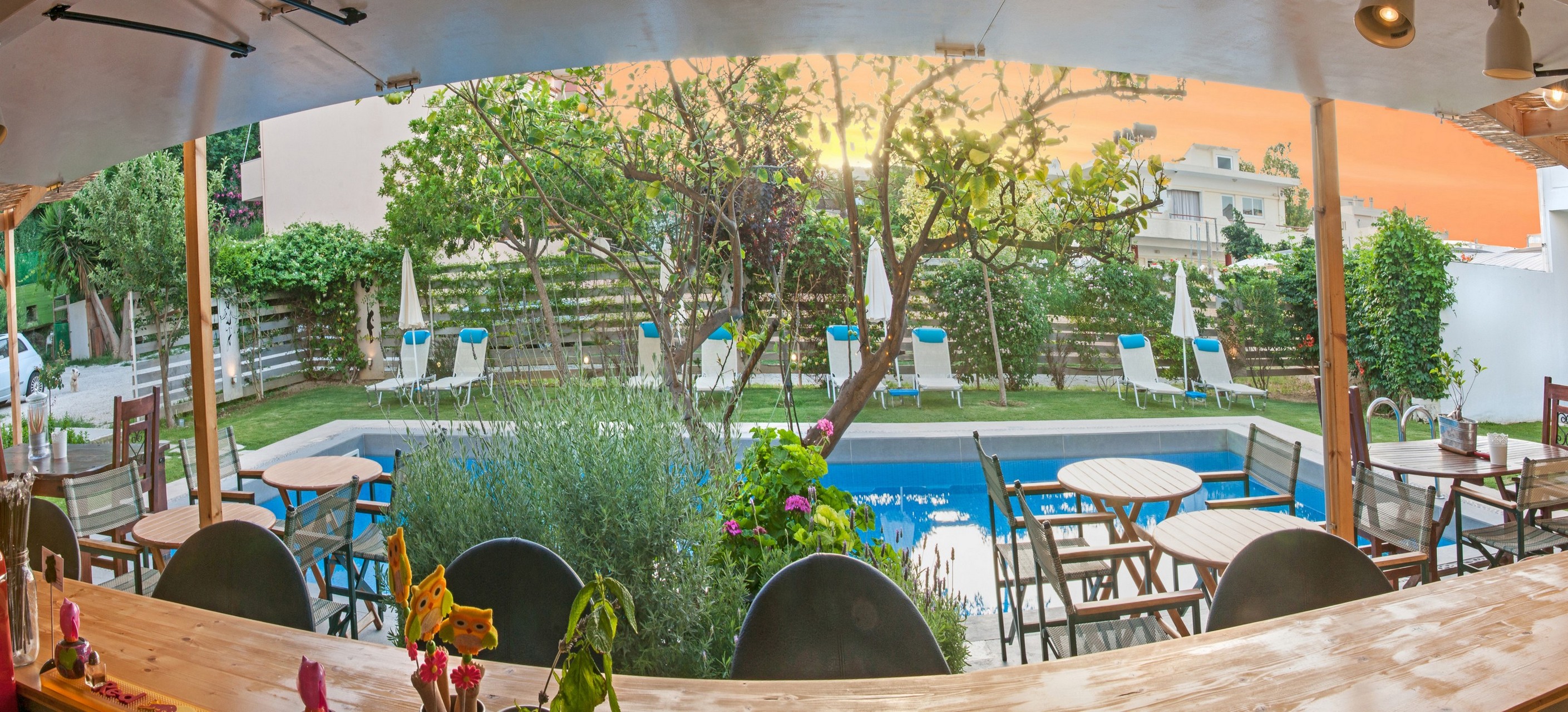 Most of the rooms have a view of the pool and the interior garden, with beautiful Yucca palm trees. At the pool bar you can taste refreshing cocktails with fresh herbs and Cretan aloe from our garden.