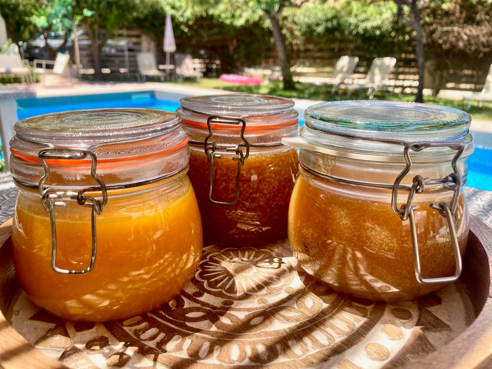 Marmalade made by us, kaltsounakia with spinach, Cretan olive oil, "kouloura", orange cake with extra virgin olive oil (also home-made), fresh fruit and vegetables in-season, Greek yoghurt with thyme honey from the area, sweets on the spoon, freshly squeezed juice from local oranges, and fresh eggs prepared as per your preference.
